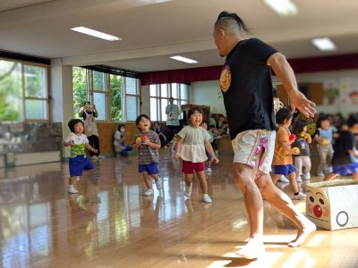 訪れたのはめぐみ幼稚園。ダンス、綱引き、玉入れとパワーいっぱいの園児約50名と交流。