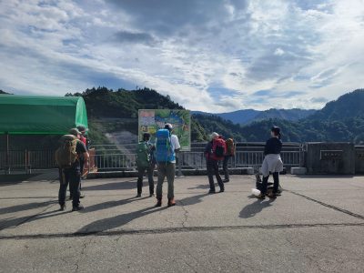階段を登っていくと、ダムを上から見下ろせます。ダムにある看板を使って奥只見について説明中。半分は福島県って知ってましたか?