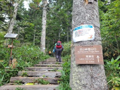 沼尻を出発して少しすると白砂峠に到着。木道や広い湿原のイメージが強い尾瀬ですが、実はこのように木道以外の場所もあります。足元に注意しながら進んでいきます。