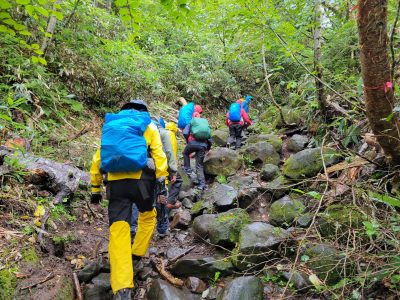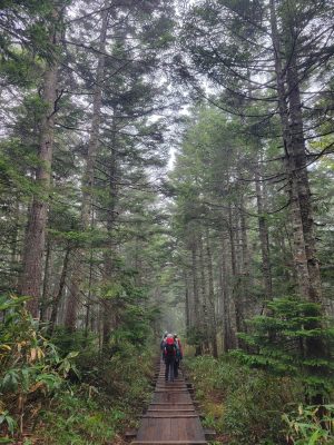 いよいよ入山開始!この日は雨模様で木道が濡れていたので、滑らないよう歩き方のアドバイスを聞いて登り始めます!