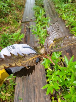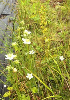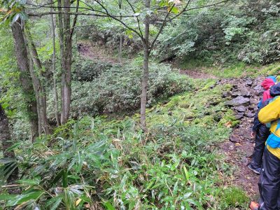 今回はいたるところで「ウメバチソウ」が咲いているところが見られました。雨で体力を奪われる中、見つけるたびに「可愛い~」と参加者は癒されていました。