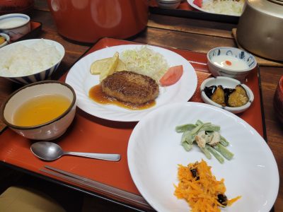 今回は1階のお部屋でしたが、2階の部屋からは目の前一面の尾瀬ヶ原が望めます!夕食前にお風呂に入り、待ちに待った夕食タイム。