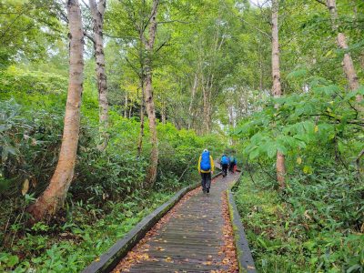 宿を出発し約5時間半、無事全員大きなケガなく「御池」に到着!少し遅いお昼休憩です。お昼は宿で用意してもらったおにぎり弁当。晴れている日は道中の湿原で景色を見ながらゆっくり昼食も最高ですよ!
