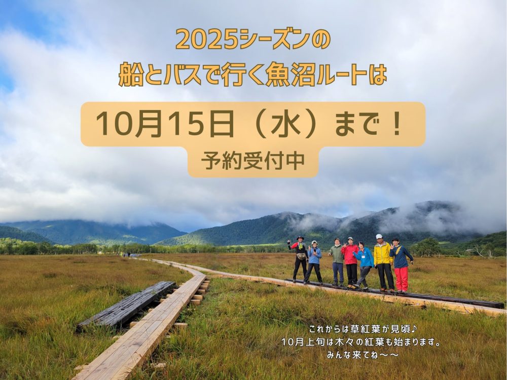 魚沼市から船とバスで行く尾瀬ルートは 10月15日(水)まで。まだまだ予約受付中です!こられからさらに紅葉が進む尾瀬はとても綺麗ですよ。