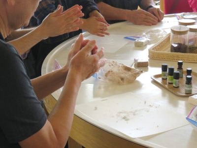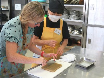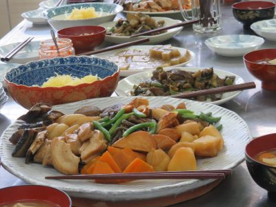 昼食は「かけはし」にて郷土料理体験を行いました。地元のおかあさんたちに調理方法を教えてもらいながら一緒に料理を楽しみました。ゼンマイの煮物、えご、なすみそ炒めに、塩こうじの漬物など。魚沼のごちそうです。