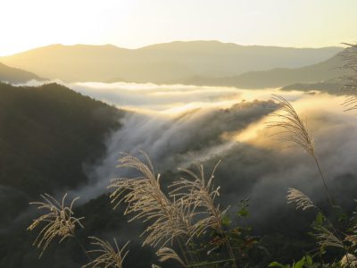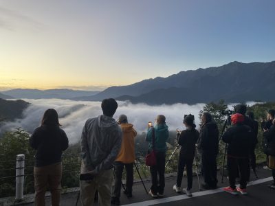 まだ夜が明けきらぬ早朝、「滝雲」を見るためジャンボタクシーに乗って枝折峠へ向かいます。条件がそろわないと見られない景色ですが、この日はとても綺麗に見ることができました。