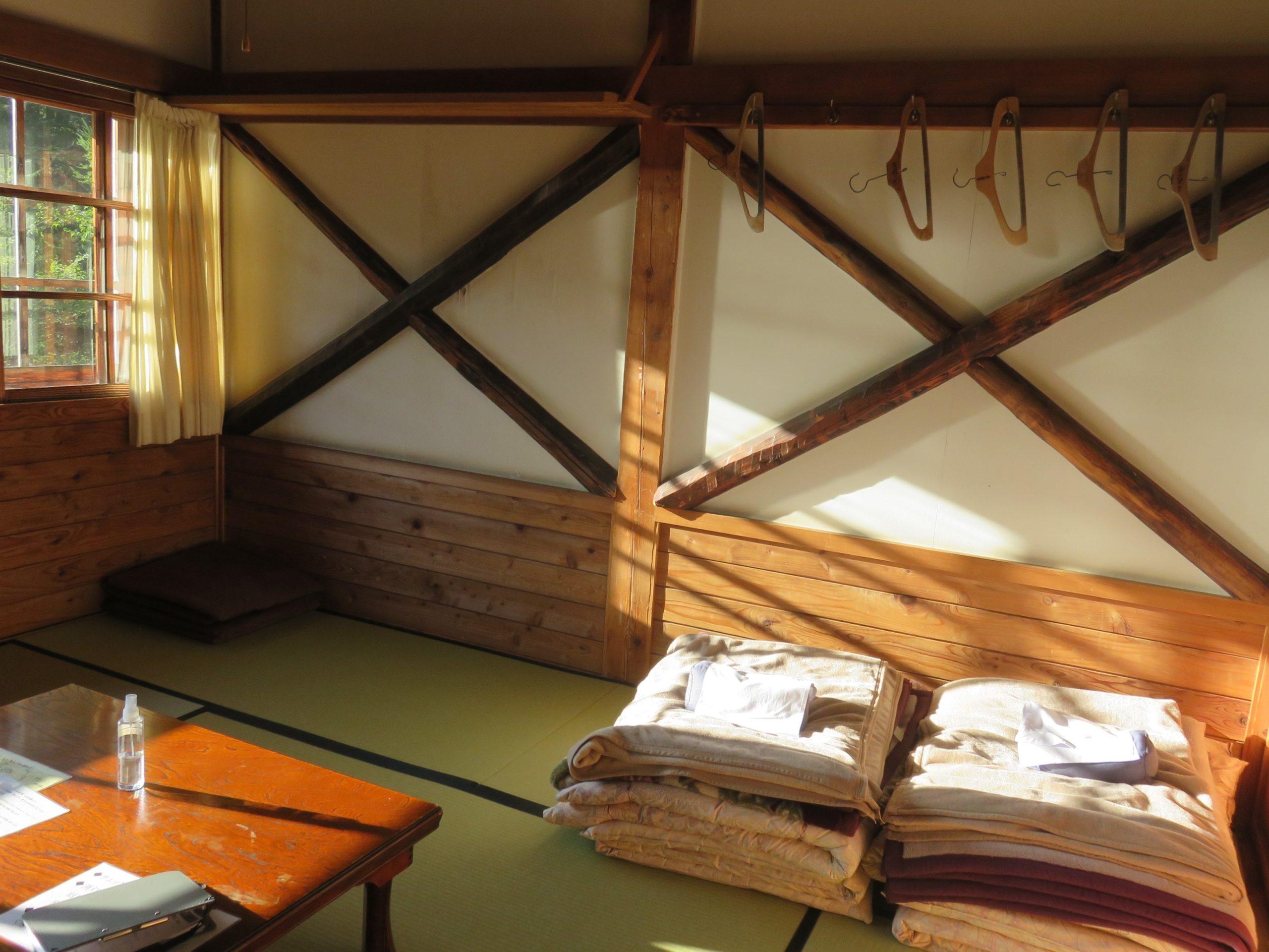 山小屋ならではのシンプルな宿泊体験ですが、窓の外には静寂と水面のきらめき。