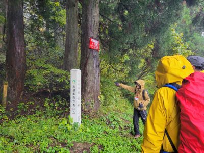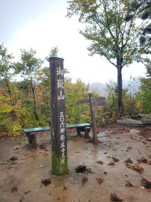 本来はここまでくると越後三山(左から越後駒ケ岳、中ノ岳、八海山)が一望できるのですが、今日はあいにくの雨模様のため、越後三山を望むことはできず、次回来た時のお楽しみとなりました。