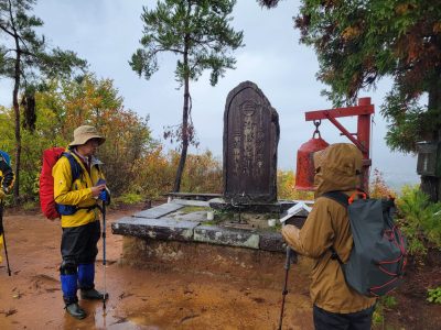 雨の中「栃原峠登山口」からゆっくり歩いて1時間ちょっと。