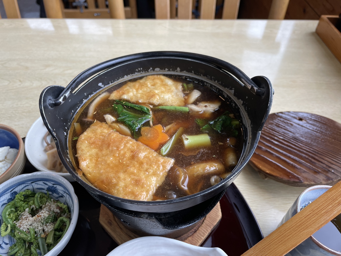みそ仕立ての汁の中には、きのこと、ぜんまい・ワラビ・うど等の山菜がたっぷり。山のごっつぉですね!