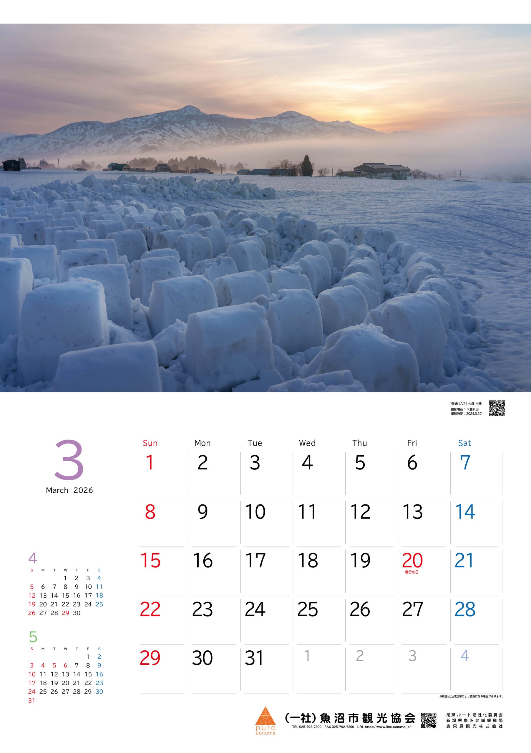 豊かな自然に恵まれた魚沼市では、「滝雲」や「雪上桜」など魚沼市特有の絶景はもちろん、豪雪地域ならではの雪原や、日常の中で心惹かれる風景。そんな瞬間を捉えた第21回魚沼市フォトコンテストの入賞作品31作品の中から、厳選した13作品を使い作成したオリジナルカレンダーが完成しました!各月でその時期の魚沼の魅力が詰まったカレンダーとなっています。