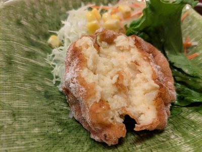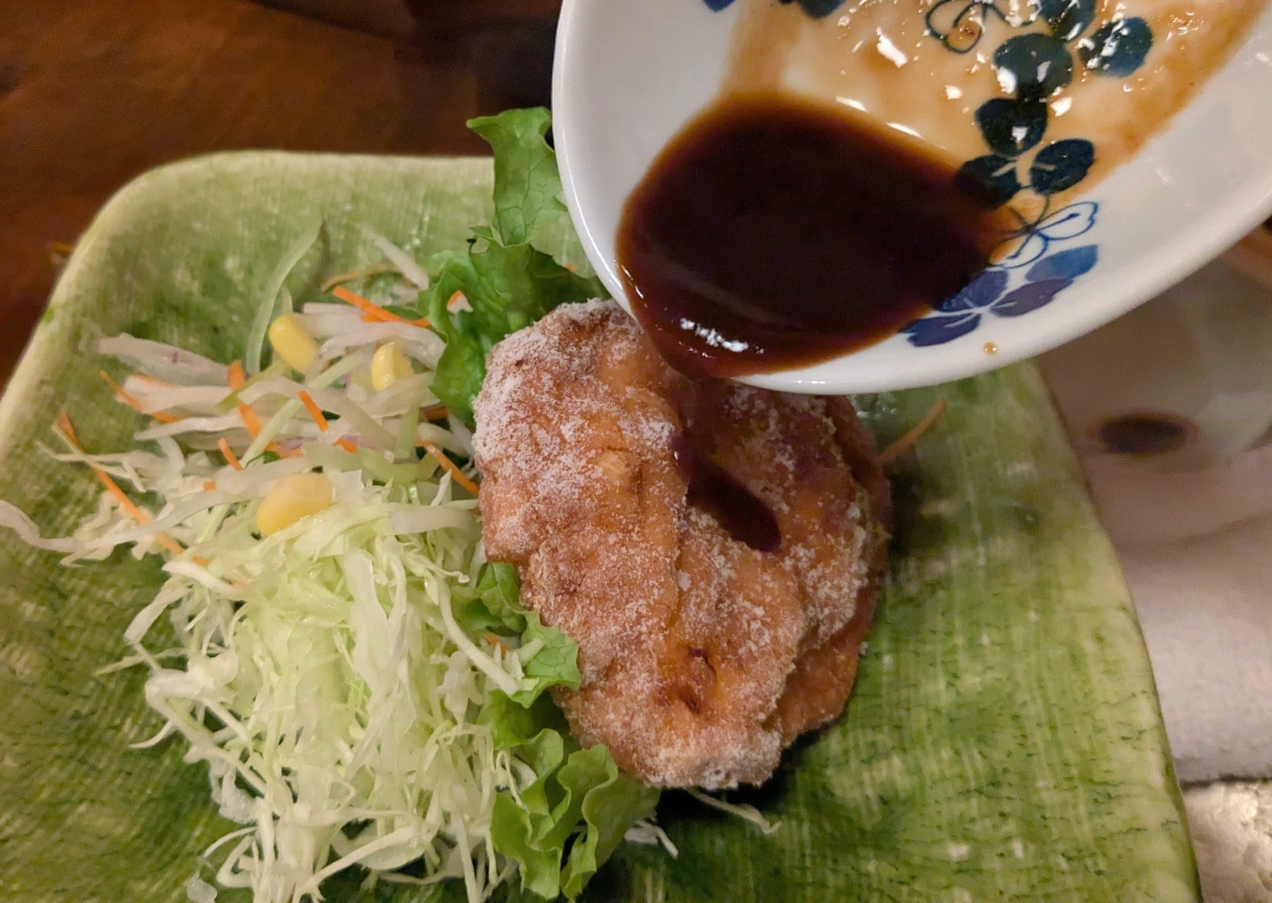 まずはお店自慢の一品「えび真丈揚」から。別添えの特製ソースをお好みでかけていただきます。フワフワ感がたまらない、ソースなしでも十分なおいしさです。