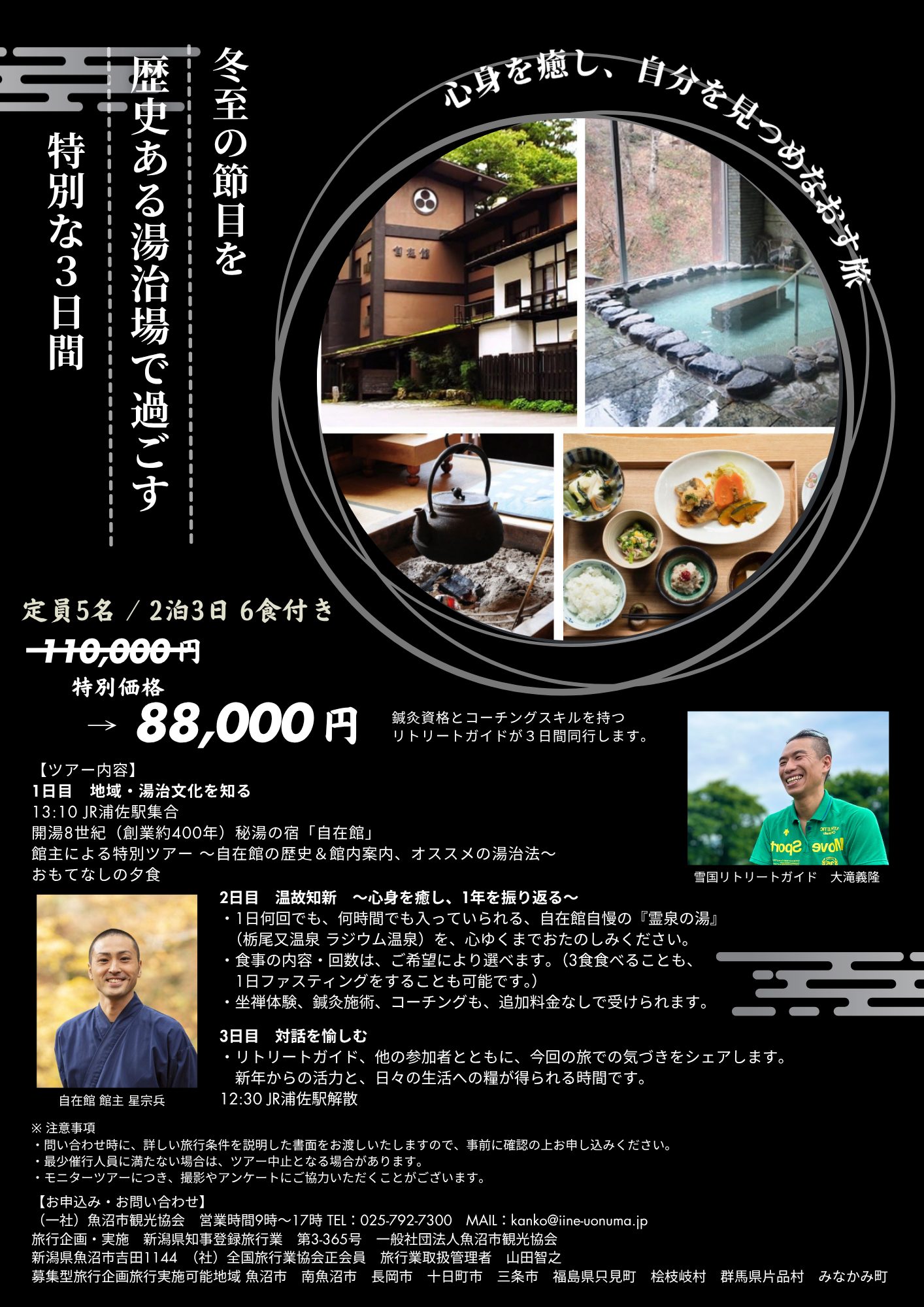 【リトリートツアー】To-ji 〜温故知新 古の知恵に学び、今を整える〜(2泊3日)開催のお知らせ 2025年11月16日 冬至の節目を歴史ある湯治場で過ごすリトリートツアーを開催いたします。 心身を癒し、自分を見つめなおす旅に出かけてみませんか?宿泊先は栃尾又温泉の自在館です。 ◇詳細・お申し込みはこちら