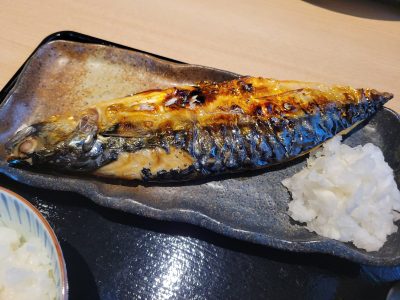 落ち着いた雰囲気の店内で、照明がほどよく当たった焼き鯖がキラリと輝き、見るからに食欲をそそります。