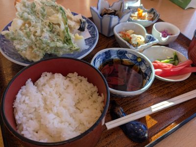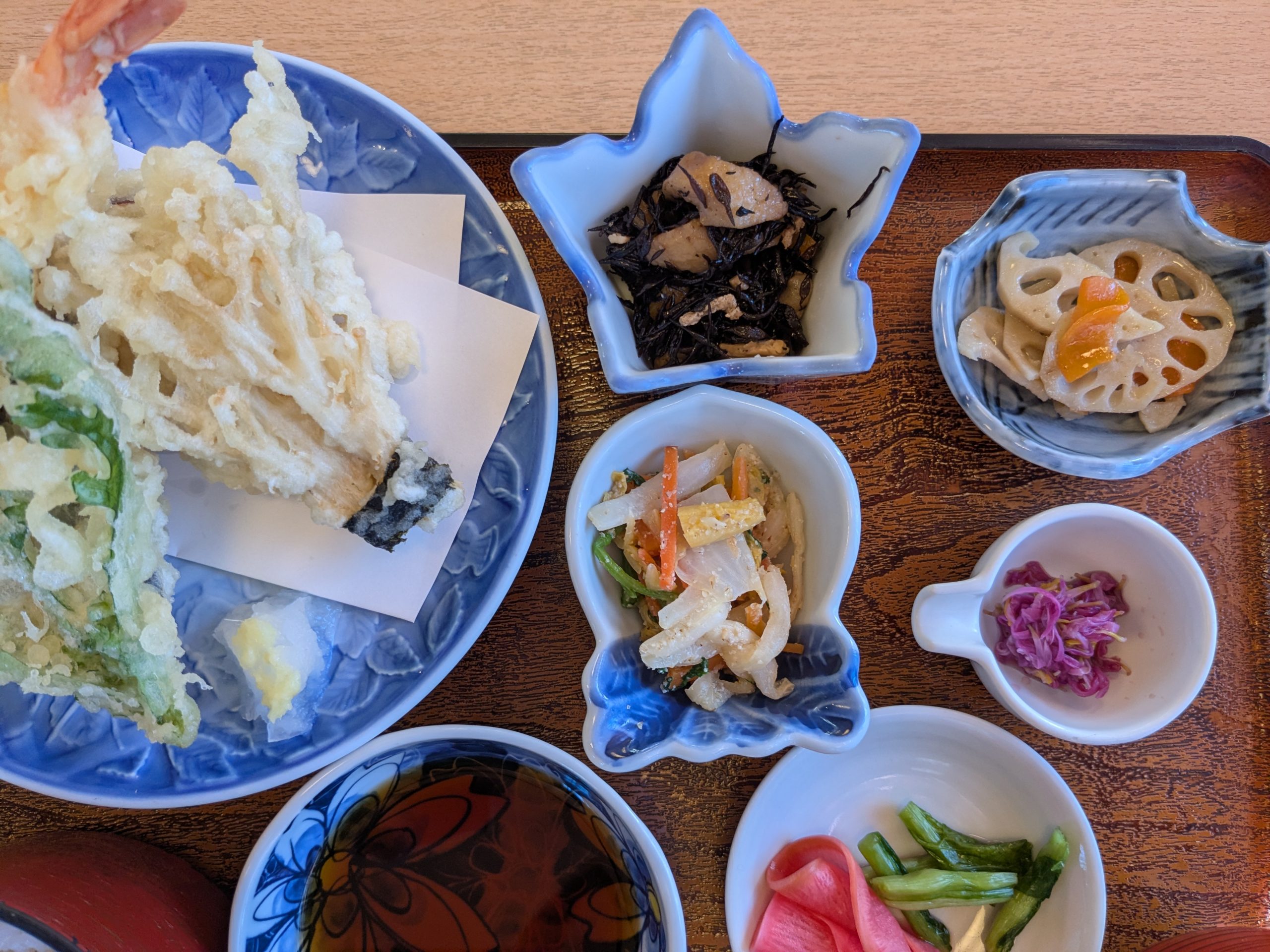 “魚沼産コシヒカリ定食”実食レポート 第十一弾 2025年11月23日 レストラン モンブラン 季節の天ぷら定食 1,320円 天ぷらのほかに、小鉢もたっぷりついた、嬉しい定食です。 メインの天ぷらは、大きな海老天に加え、季節のレンコンやサツマイモなどのお野菜が甘くておいしかったです。 お惣菜もすべて手作りで、ご飯がすすみました。 デザートには旬の栗の渋皮煮(こちらももちろん手作り!)が添えられており、やさしい味わいに思わず笑顔に。 可愛い器や、店内のレトロな雰囲気も相まって、ゆったりとした穏やかなランチタイムを過ごすことができました。