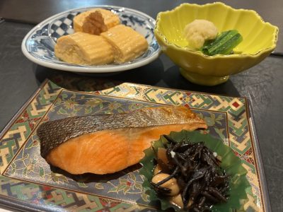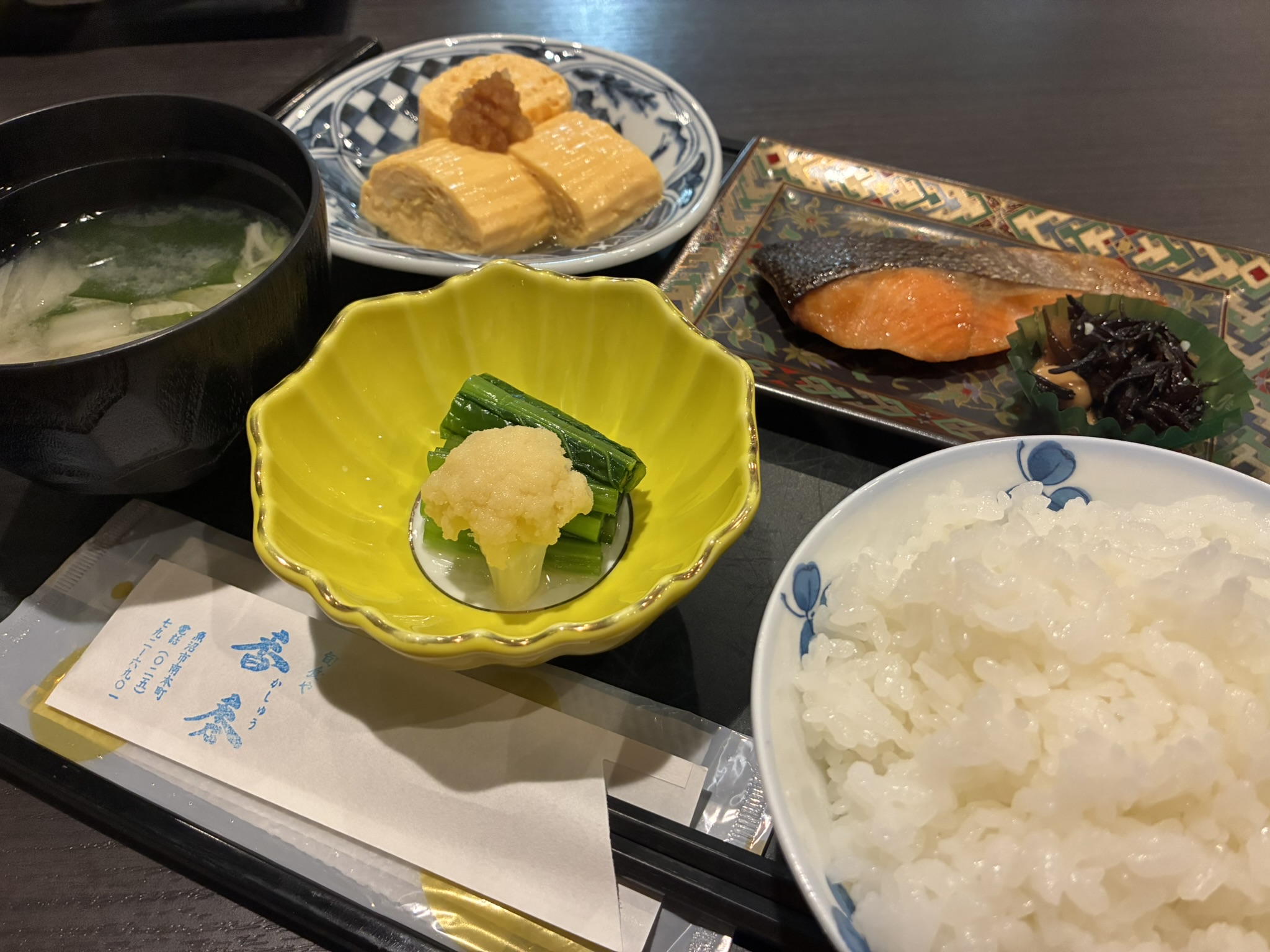 焼き魚とだし巻き玉子、小鉢、付け合わせにお味噌汁がついて、