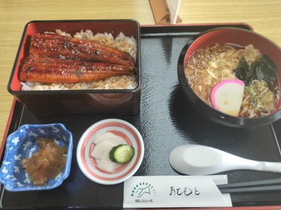 定食が届き、蓋を開けると、うなぎのタレの良いにおいがしてきましたが、焦る気持ちを押さえながら、人気の掛そばをまずは一口。