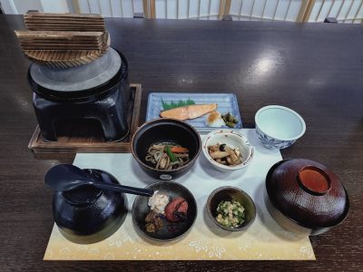 おかずは、きのこの佃煮、ぜんまい煮、焼き魚、漬物3種、きりざい、けんちん汁と、ご飯がどんどん進むものばかりです。気づけば大盛りご飯もあっという間に完食してしまう満足感。どれを組み合わせても最高の一口が楽しめます。
