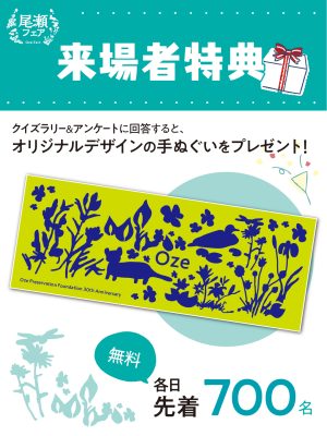 クイズラリー&アンケートに回答された方に、尾瀬保護財団30周年を記念して特別に製作したオリジナルデザインの手ぬぐいをプレゼント!(無料)