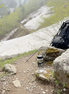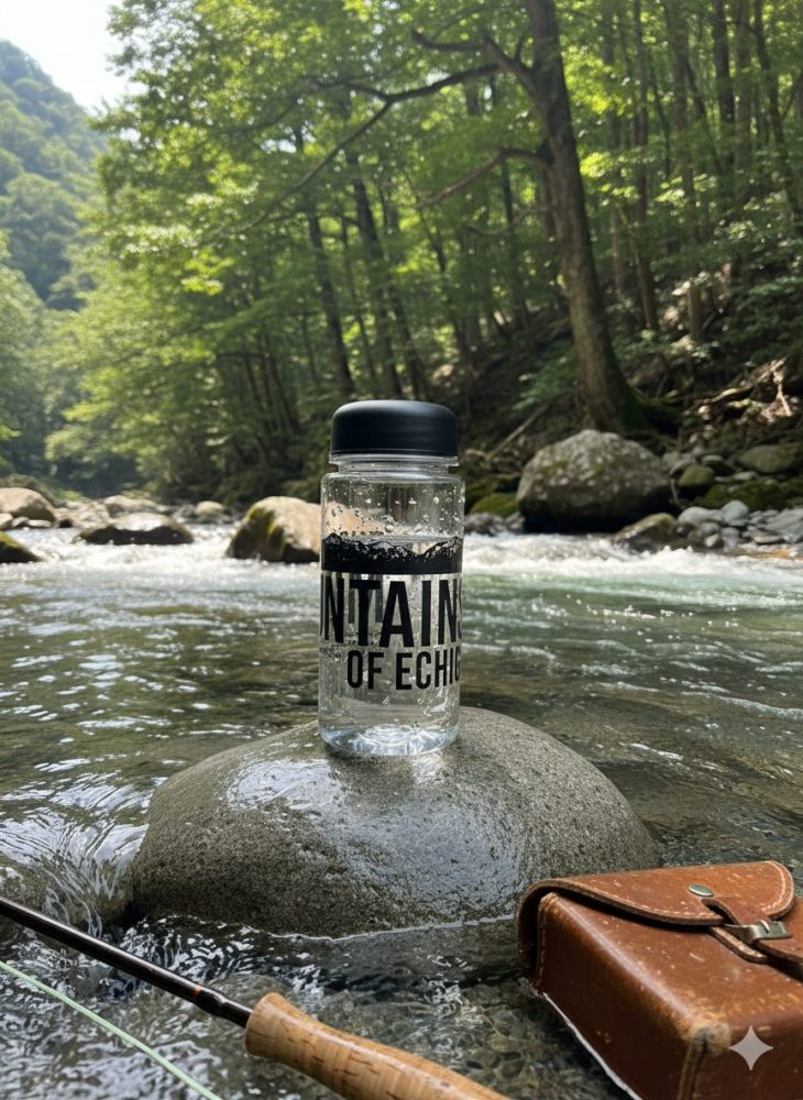 \”買って” “使って” 楽しむ魚沼観光 / がコンセプトの魚沼市観光協会オリジナルグッズ。今回は、越後三山(八海山・中ノ岳・越後駒ヶ岳)をモチーフにした、シンプルで使いやすいクリアボトルです。