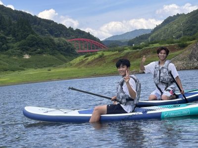破間川ダムは自然に囲まれた静かなエリアです。人里離れたダム湖でSUPを楽しむことができます。体験後は温泉で癒しのひとときを過ごせます。