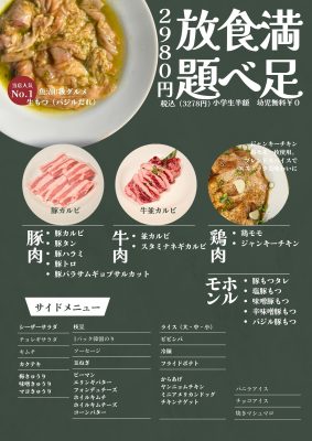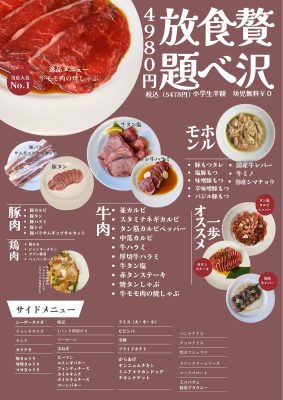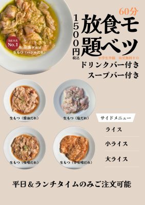 もっといろいろな種類のお肉が味わえる「贅沢食べ放題」や、土日祝日ランチ&平日ディナー(金曜日除く)は「60分モツ食べ放題」(ライスおかわり自由、ドリンクバー、スープバー付き)も1,500円(税込)も提供しています。
