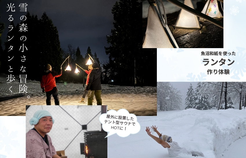 ツアー ふかふかの新雪ダイブ! 〜ココロもカラダもHOTになるサウナ体験〜新潟県・魚沼市の中でも有数の豪雪地帯に位置する 「浅草山荘」。 冬になるとまわり一面が、 真っ白な雪が広がっています… この場所でしか出来ない雪中テントサウナからの「雪ダイブ」体験! ふか...手作りランタンで歩こう! 〜雪の森ナイトウォーク〈おにぎり&温泉つき〉〜今回の舞台は・・・ 新潟県・魚沼市にある、 標高262mの小さな里山「駒見山」の麓。 その麓には、スキー場や日帰り温泉施設があります。 地元の和紙職人から譲り受けた、 木の枝と和紙を使った手作りランタ...保護中: JR浦佐駅発着【雪育モニターツアー】雪の森ナイトウォーク & 雪中テントサウナこの投稿はパスワードで保護されているため抜粋文はありません。 取引条件説明書面・契約書面 ダウンロードはこちら