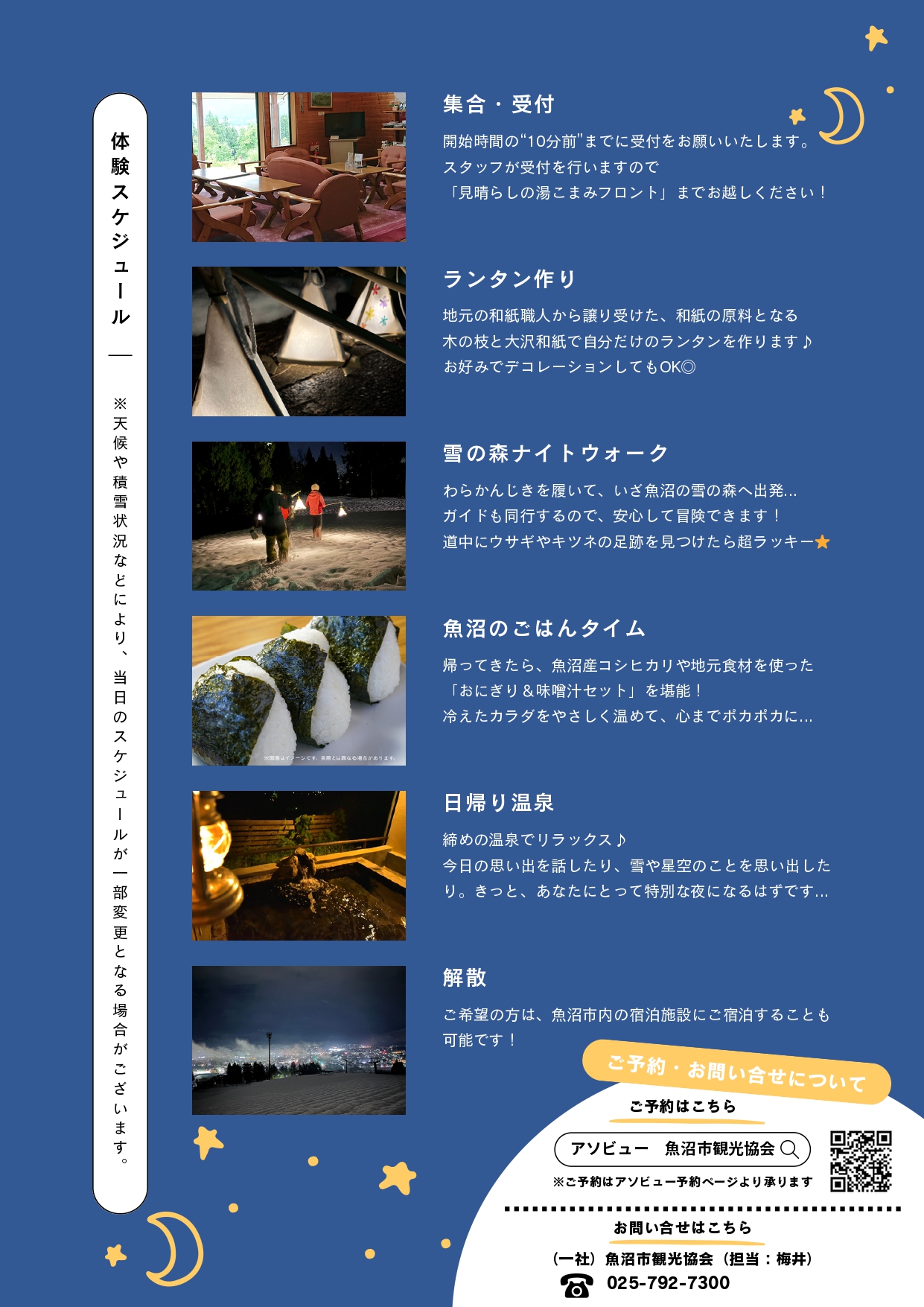 「魚沼市観光協会」へご連絡ください。(TEL:025-792-7300) ※天候や積雪状況などにより、当日のスケジュールが一部変更となる場合がございます。あらかじめご了承ください。