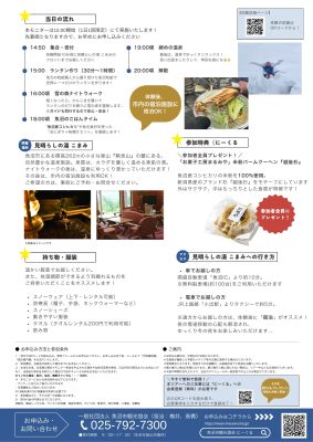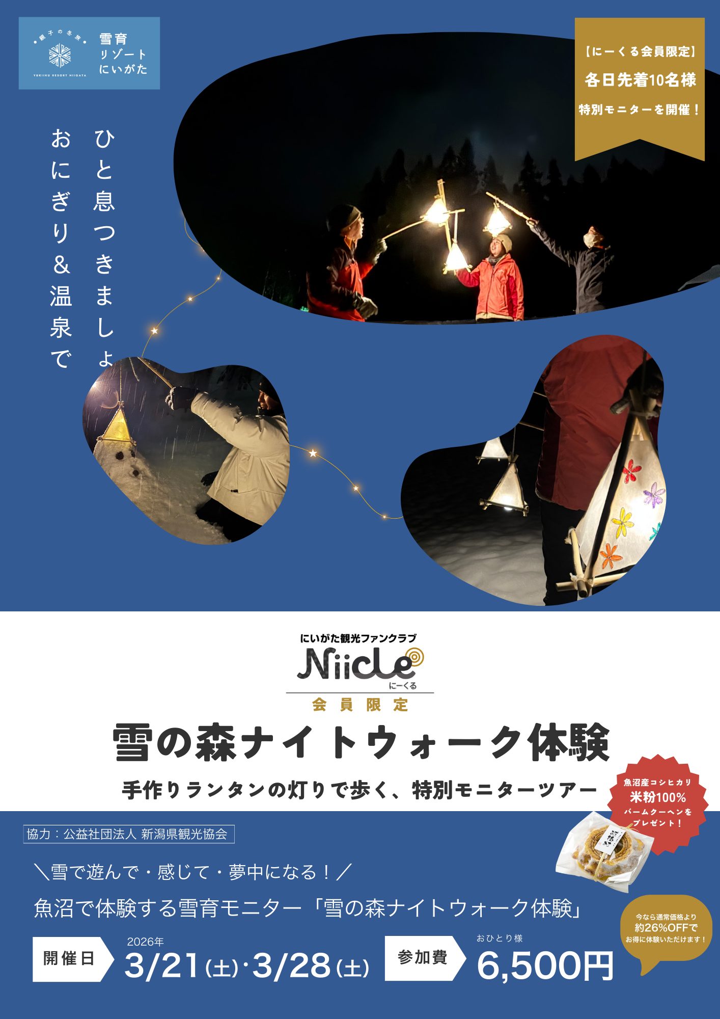 本ツアーにおける参加条件は以下になります。 ・にいがた観光ファンクラブ「にーくる」会員の方 ・アンケート記入にご協⼒いただける方 ・写真撮影にご協⼒いただける方(メディア等の広報に使⽤いたします。) |