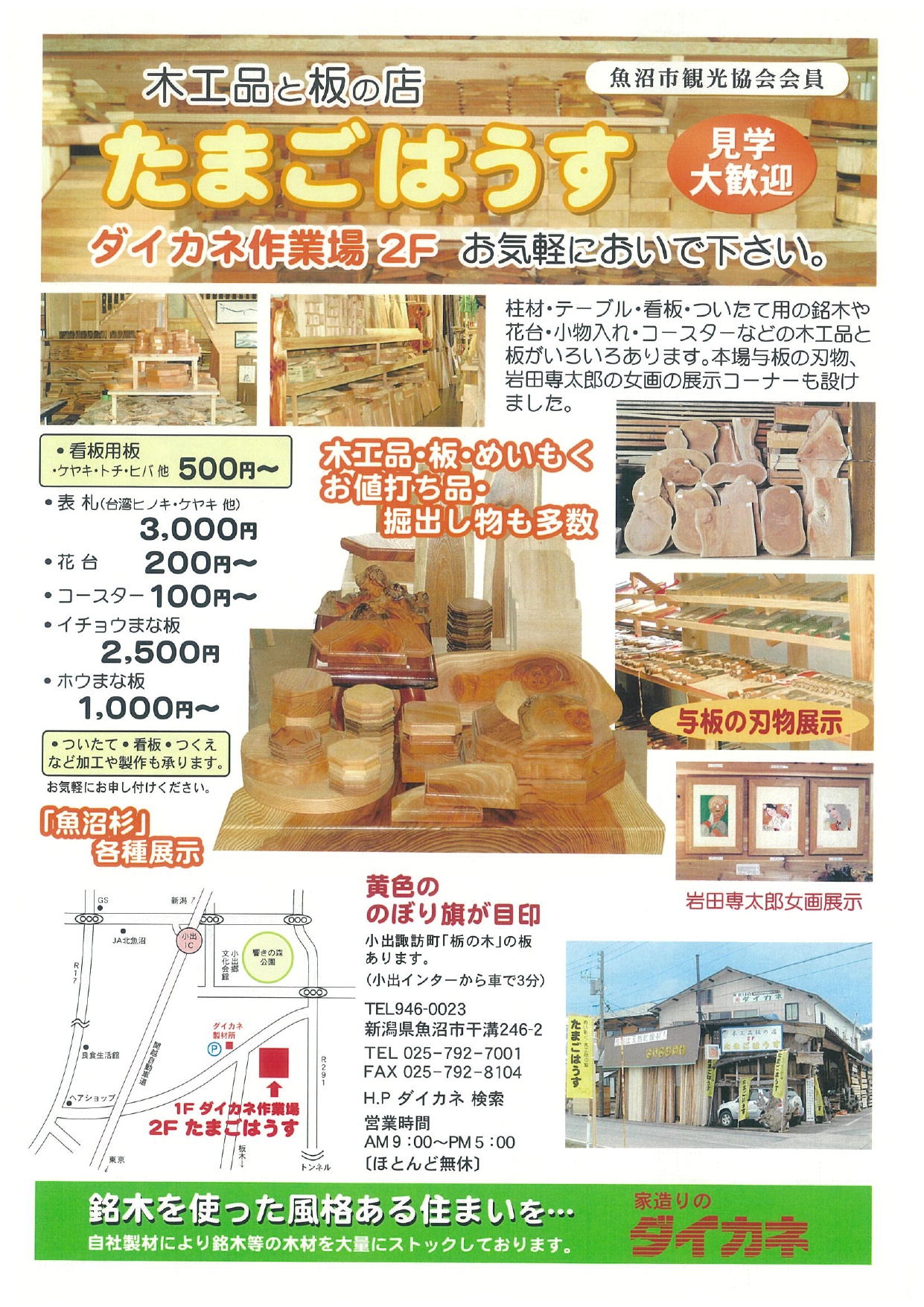 木工品と板を販売するお店。「魚沼杉」を使った商品も販売しています。工務店ダイカネの2階にあります。ぜひお気軽にお立ち寄りください。