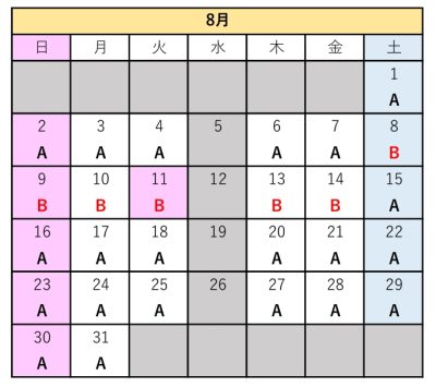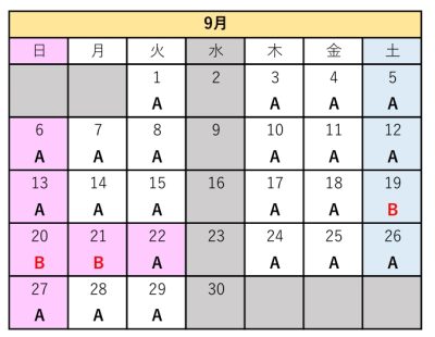 | 予約人数 | 代金(A日程) | 代金(B日程) |