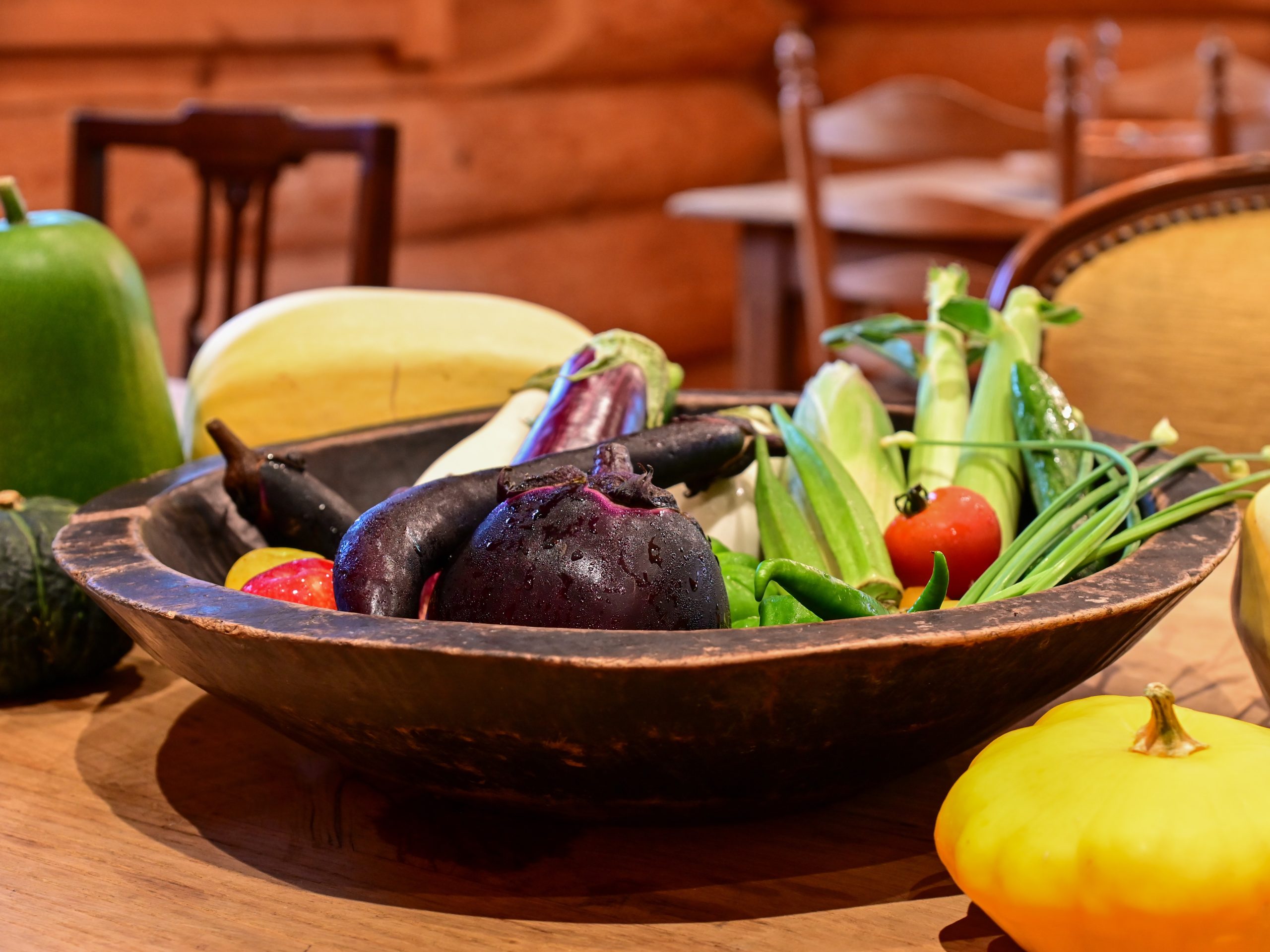夏はナス等の夏野菜、秋は天然物のキノコ。週末は店頭でイワナやアユの炭火焼きもございます。